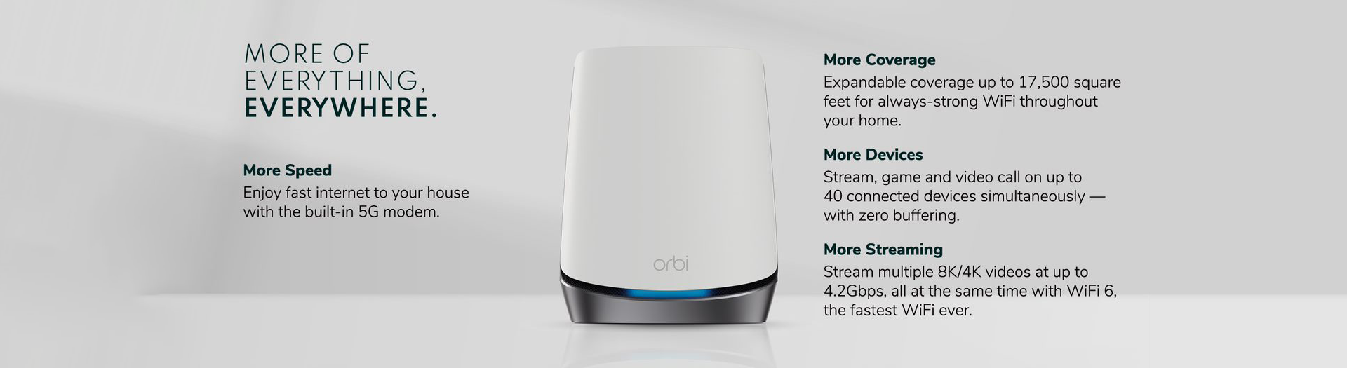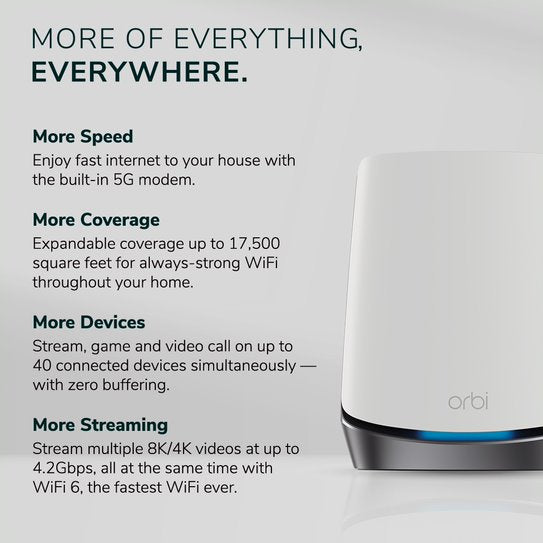 Orbi’s unique shape and height encase ultra-premium, high-power components to deliver significantly better coverage and overall performance than the competition.