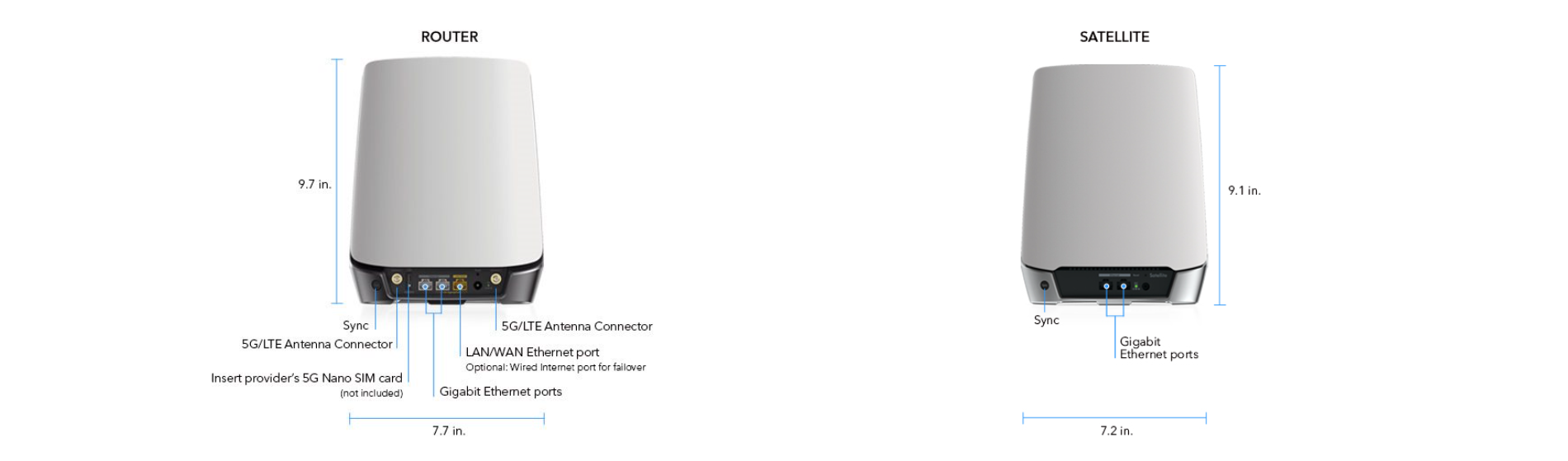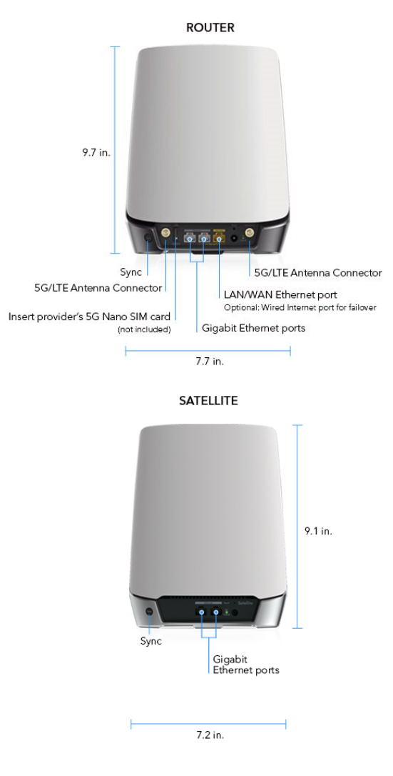 - Ports — Orbi 5G LTE Router : Two (2) 10/100/1000Mbps Gigabit Ethernet LAN ports