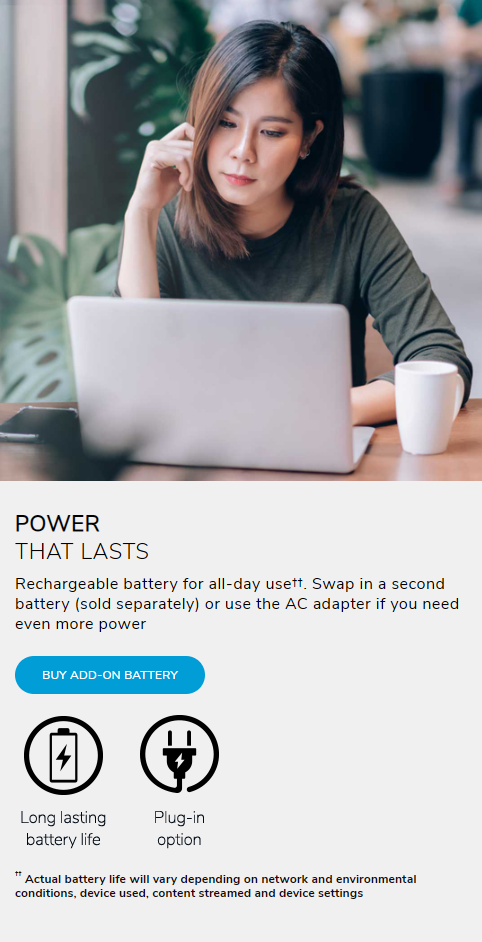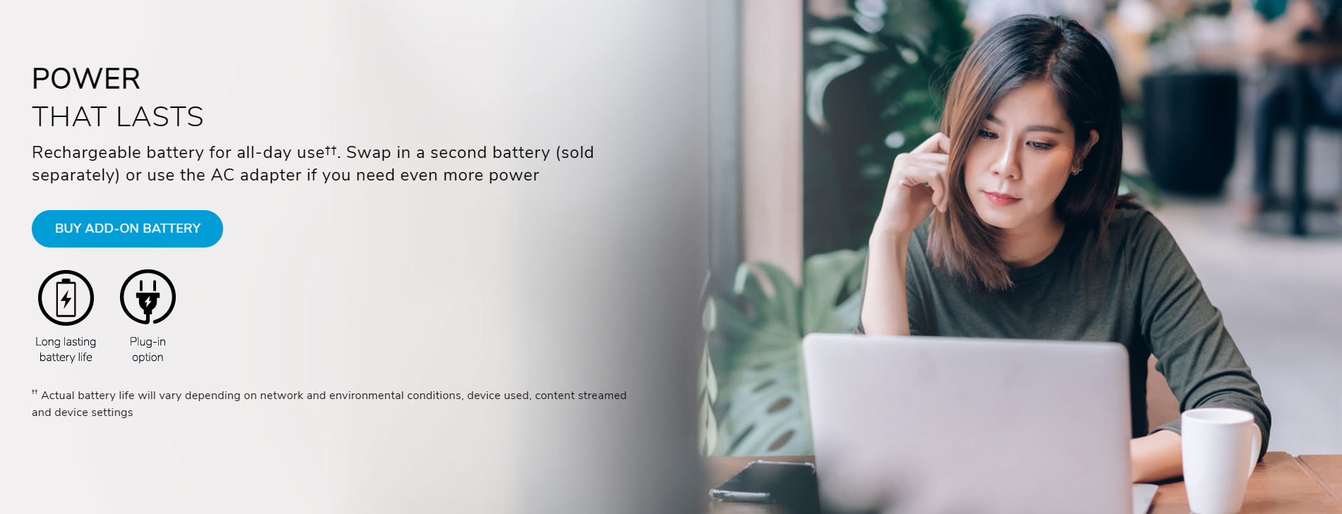 - Battery : Removable Li-ion battery (5040 mAh); Up to 11 hours of continuous usage