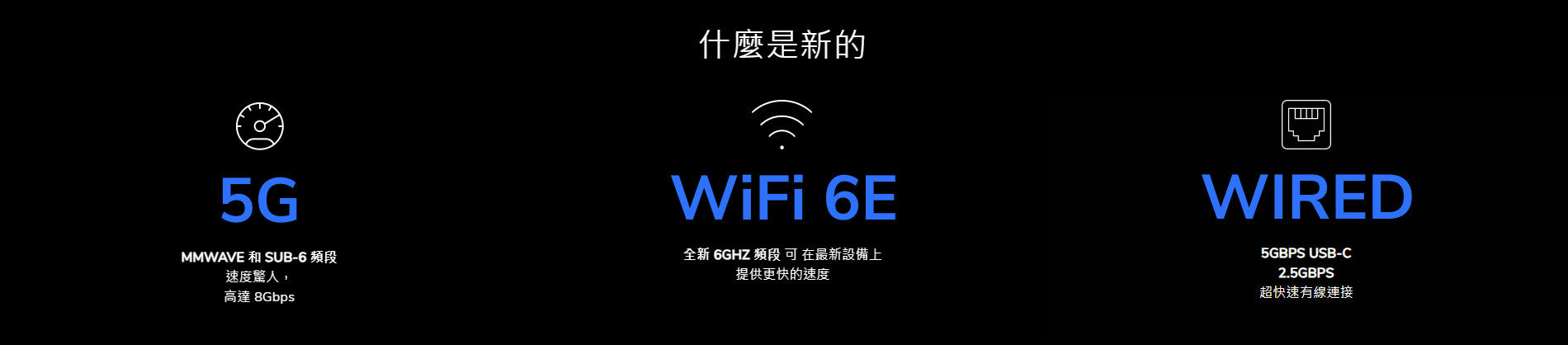 - 利用尖端的 5G 毫米波和 WiFi 6E 技術,解鎖高達 8Gbps‡ 的 5G 速度和高達 3.6Gbps 的 WiFi 速度。,同時支援最多 32個裝置。