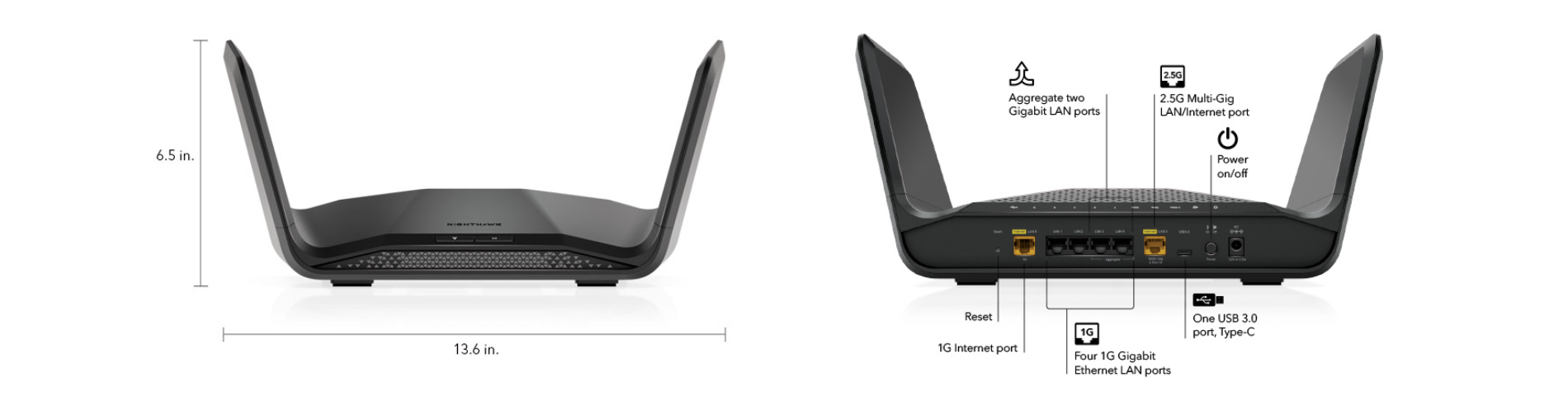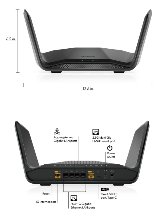 - 以太網埠 : 五(5)個10/100/1000 Mbps千兆位以太網埠+一(1)個2.5G/1Gbps多千兆埠