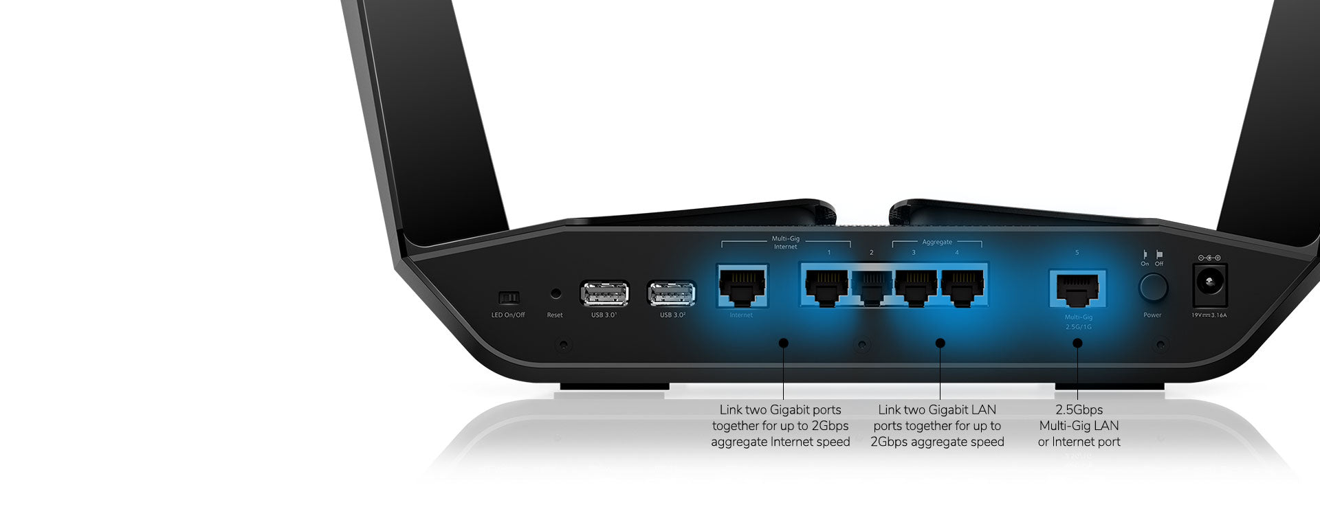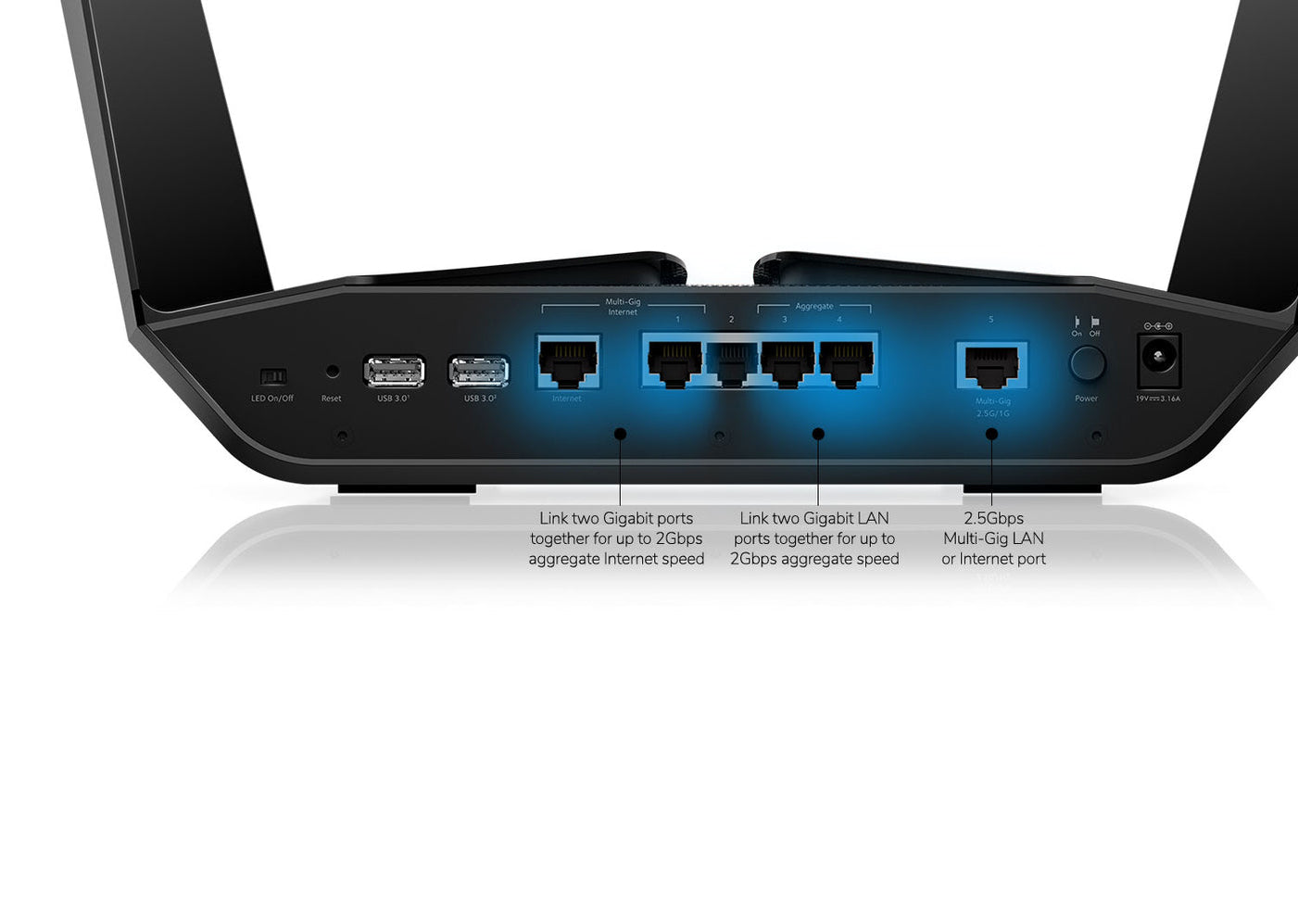 使用 2.5G 乙太網路連接埠或 2Gbps 連結聚合將千兆位元+速度傳送到您最嚴苛的設備,並將更多有線設備插入四個額外的千兆位元乙太網路埠