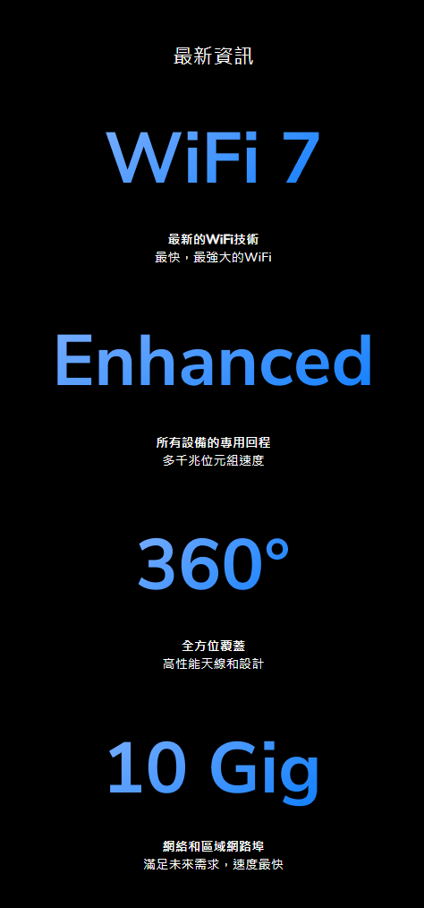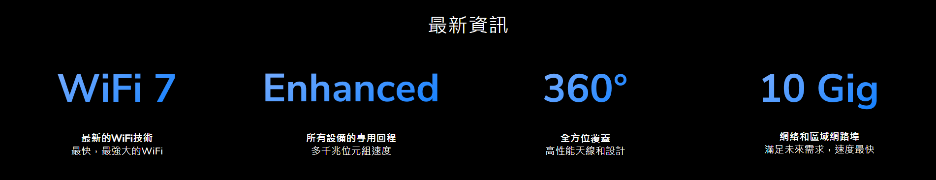 † 最大無線信號速率源自IEEE®802.11規範。實際數據吞吐量和無線覆蓋範圍將因網絡和環境條件(包括網絡流量,設備限制和建築施工)而有所不同。NETGEAR對本產品與未來標準的兼容性不做任何陳述或保證。連接到其他802.11be 27Gbps設備時,可實現高達27Gbps的無線速度。連接到其他無線速度為 5Gbps設備時,可實現高達5Gbps的無線速度。連接到其他有線速度為 2.5Gbps設備時,可實現高達2.5Gbps的有線速度。連接到其他有線速度為 10Gbps設備時,可實現高達10Gbps的有線速度。 ***要求WiFi上支援320MHz帶寬的客戶端設備比80MHz WiFi頻寬快四倍。 †† 千兆或多千兆互聯網速度所需的千兆服務計劃和兼容纜線數據機。 1 由Bitdefender®支援的NETGEAR® Armor™ 需要在1年免費試用後付費訂閱。請訪問 www.netgear.com/armor 3 MU-MIMO功能要求路由器和客戶端設備都支持MU-MIMO。 4 6 GHz頻段僅限於室內範圍。 <sup>5 需要支持DL-OFDMA和UL-OFDMA的兼容AX客戶端。