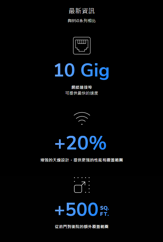 Orbi高而優雅的外形並非巧合。我們的專利天線設計可在機罩下確保全屋都能享受卓越的WiFi。Orbi 860系列的全新天線升級功能,與前一代產品相比,性能和覆蓋範圍顯著提升20%。