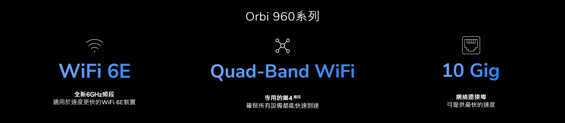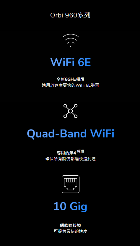 - 新增 獨家四頻段技術和專用回程WiFi可確保多達200個連接設備的最高速度